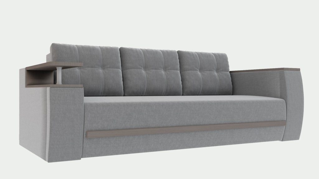 Великий місткий диван в стилі «модерн» з асиметричними підлокітниками і вставками з натурального дерева. У підлокітниках – місткі ящики для зберігання, 2 ящика для зберігання білизни під сидінням. Подушки зі знімними чохлами. Накладки на підлокітниках з МДФ. Пружинні блоки в спальній частині, каркас – з твердих порід дерева (бука). Механізм трансформації – «єврокнижка». Подушки зі знімними чохлами.