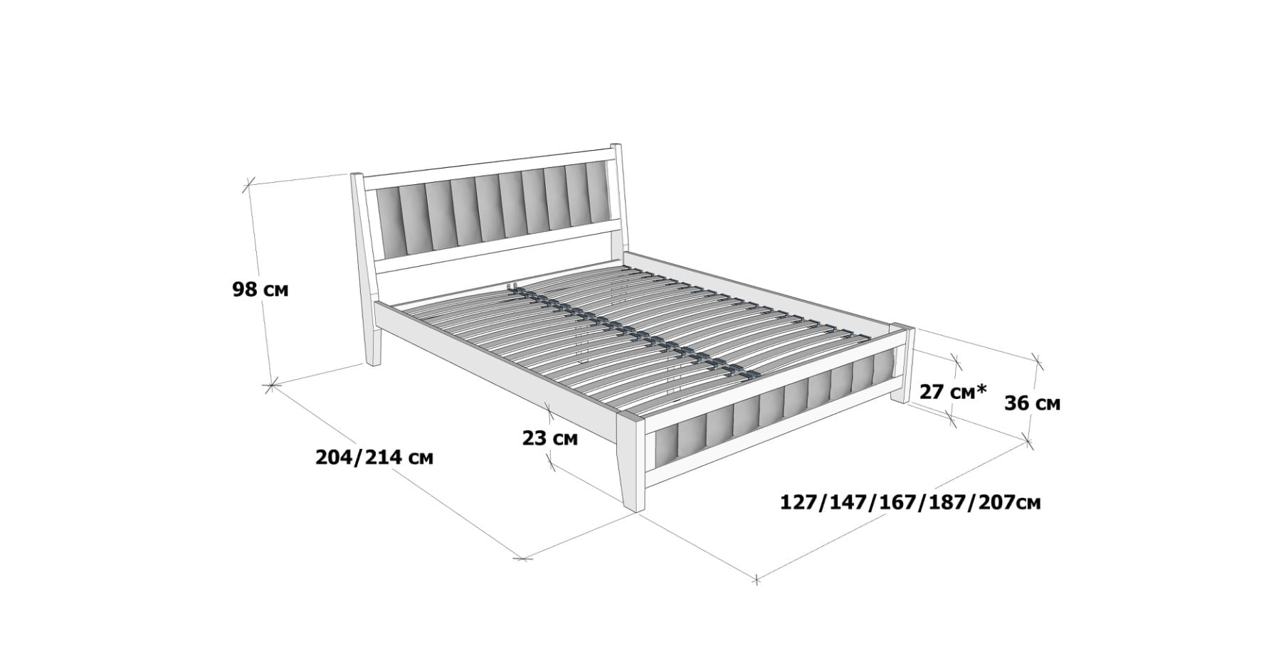 | Габарит ліжка | більший на 14 см по довжині і на 7 см по ширині від розміру спального місця |