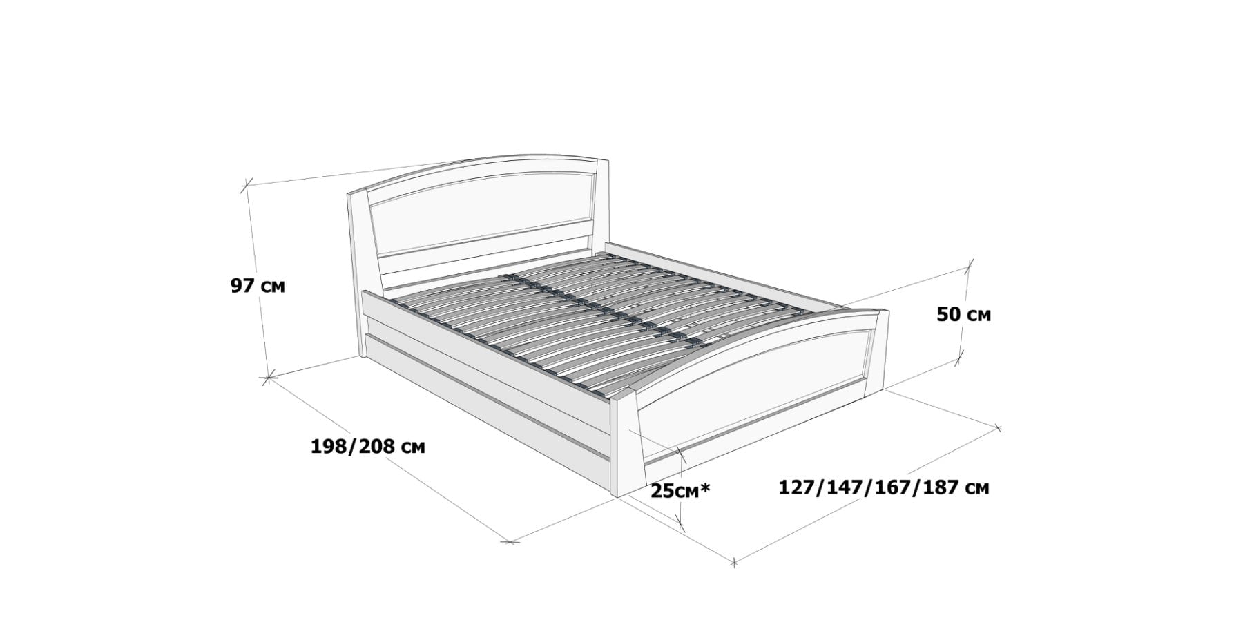 | Габарит ліжка | більший на 8 см по довжині і на 7 см по ширині від розміру спального місця |