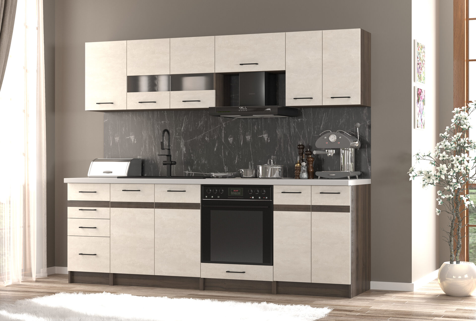 Модульна кухня “Лівія” вражає своїм витонченим дизайном та зручністю використання. Завдяки широкому асортименту елементів, ви зможете створити ідеальне рішення для будь-якого розміру приміщення. Гармонійне поєднання кольорів шовкового каменю та дуба рістретто додає простору затишку та естетики. Міцні фасади з ДСП забезпечують довговічність і стійкість до щоденних навантажень, роблячи цю кухню практичною та функціональною.