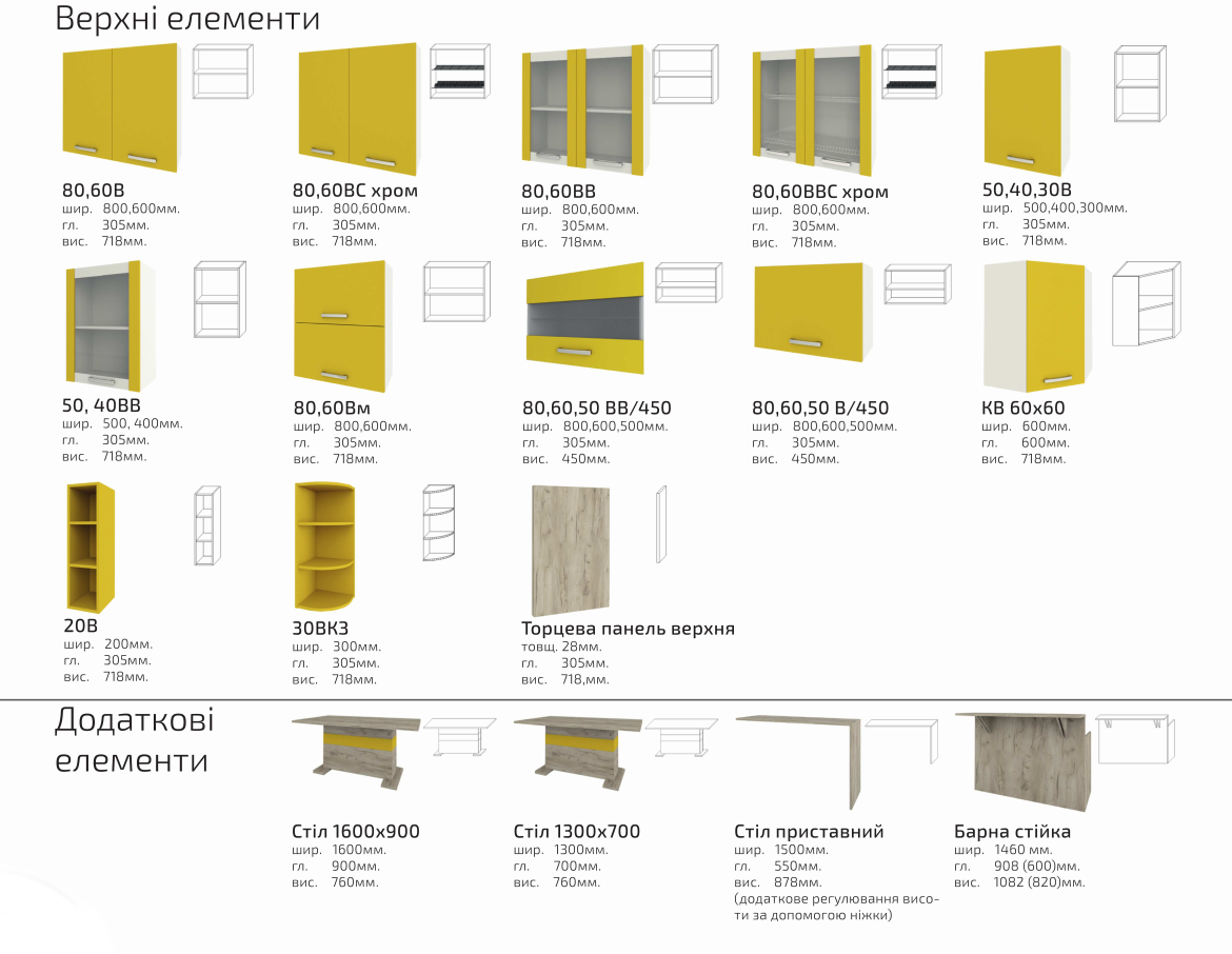 Кухня «Шарлотта» включає такі елементи як кухонний стіл 2 типів, барну стійку та стіл приставний. А для того щоб Ваша кухня мала завершений вигляд, ми додали верхні та нижні декоративні торцеві панелі. З метою удосконалення було додано нові декоративні варіанти фасадів до нижніх та верхніх елементів. Тепер кожен обирає свою кухню!