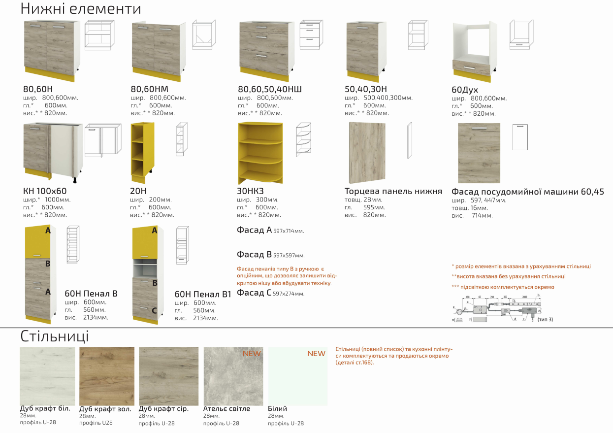 Фасад нижній – Дуб крафт сірий, дуб крафт білий, Дуб крафт золотий, білий, ательє світле, дуб сонома, дуб велінгтон.
