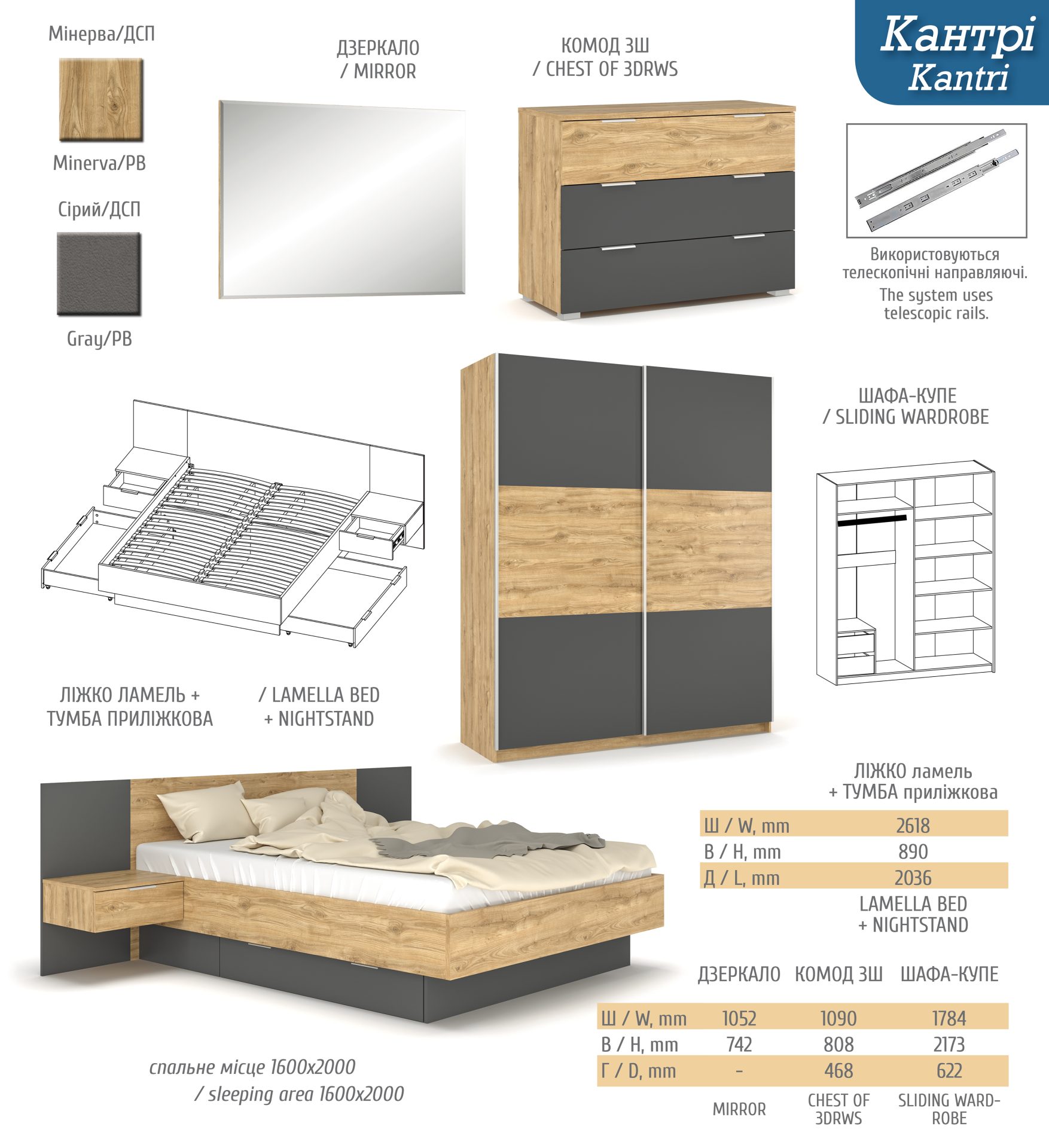 Модульна спальня Кантрі розроблена для тих, хто цінує якість, стиль та функціональність. Її фасади виконані у гармонійному поєднанні кольорів Мінерва та Сірий, що підкреслює сучасний стиль інтер’єру. До комплекту входять зручне ліжко з ламелями та приліжковими тумбами, стильний комод з трьома шухлядами, просторе дзеркало та шафа-купе. Використання телескопічних направляючих забезпечує плавне відкривання ящиків, а якісні матеріали гарантують довговічність.