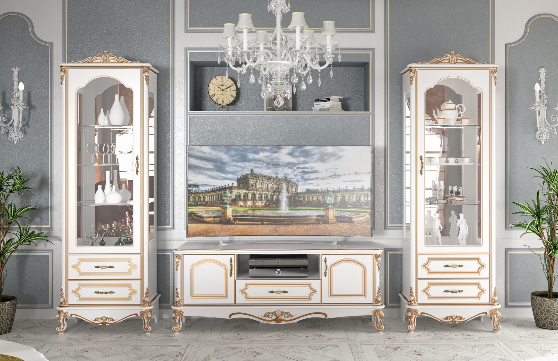 Вітальня Болонія – це приклад класичного стилю, що вражає своєю вишуканістю та увагою до деталей. Білий корпус меблів виготовлений з ДСП та МДФ з використанням патинування, що надає поверхням особливого благородного вигляду. Золотисті акценти підкреслюють витончені форми та створюють неповторний образ меблів. Завдяки наявності різних модулів, таких як пенал, комод та ТВ-тумба, вітальня Болонія дозволяє створити індивідуальну композицію, що підходить саме для вашого інтер’єру.