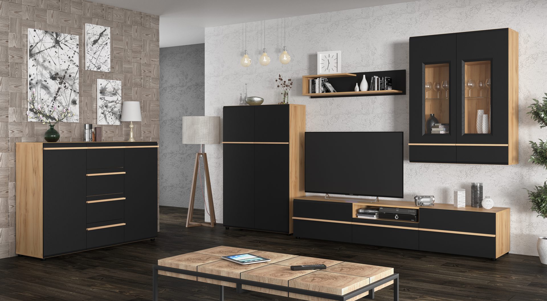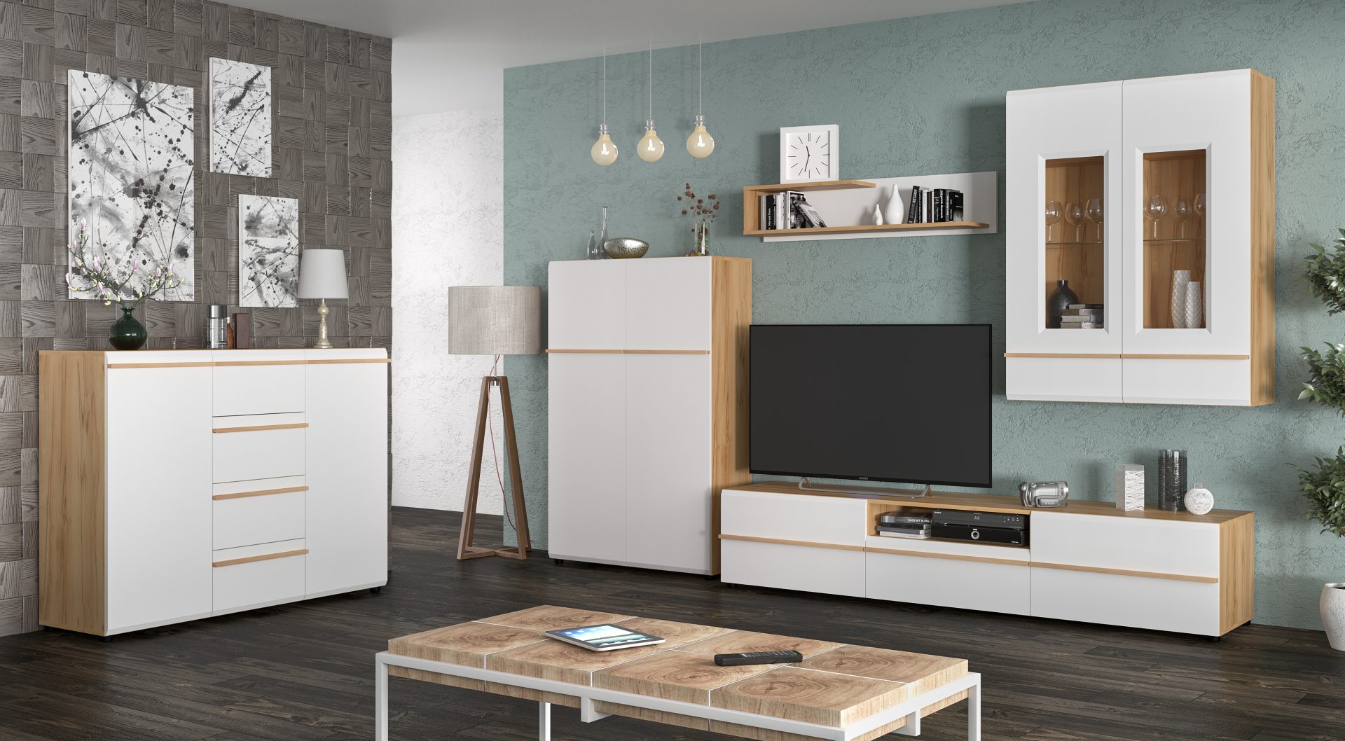 Модульна вітальня Денвер – це поєднання сучасного дизайну, функціональності та природної естетики. Контрастні фасади в білому або чорному кольорі гармонійно поєднуються з теплим відтінком дерева бук белензон, створюючи стильний та затишний інтер’єр. Натуральні дерев’яні ручки додають виробу унікальності та комфорту у використанні. Завдяки продуманій системі зберігання, що включає комоди, вітрини та полички, меблі зручні у щоденному використанні. Вітальня Денвер – це ідеальне рішення для тих, хто шукає стильний, практичний та довговічний інтер’єр.