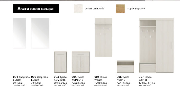 Набір Агата має відмінну функціональність і комфорт при щоденній експлуатації. Набір складається з усіх необхідних елементів для створення затишного передпокою, світлі або натуральні деревні кольори підкреслять Вашу індивідуальність.