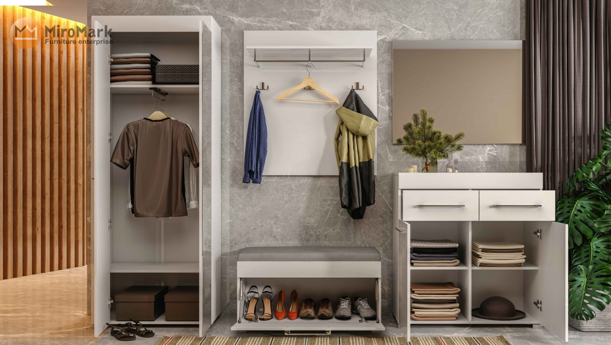 У нас можна придбати вже готові комплекти виготовлені фабрикоб MiroMark, їх також можна міксувати між собою, або замовляти лише окремі елементи. Основною функцією передпокою є зберігання верхнього одягу та взуття, тому кожен елемент комплекту є таким важливим. До того ж, у маленьких квартирах саме передпокій може заміняти гардеробну систему.