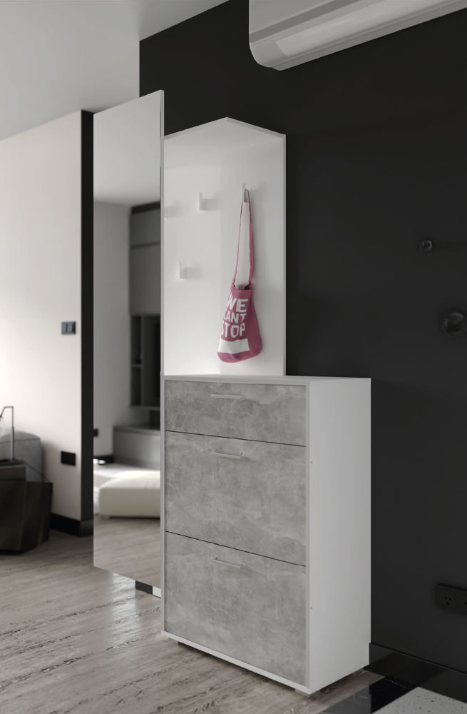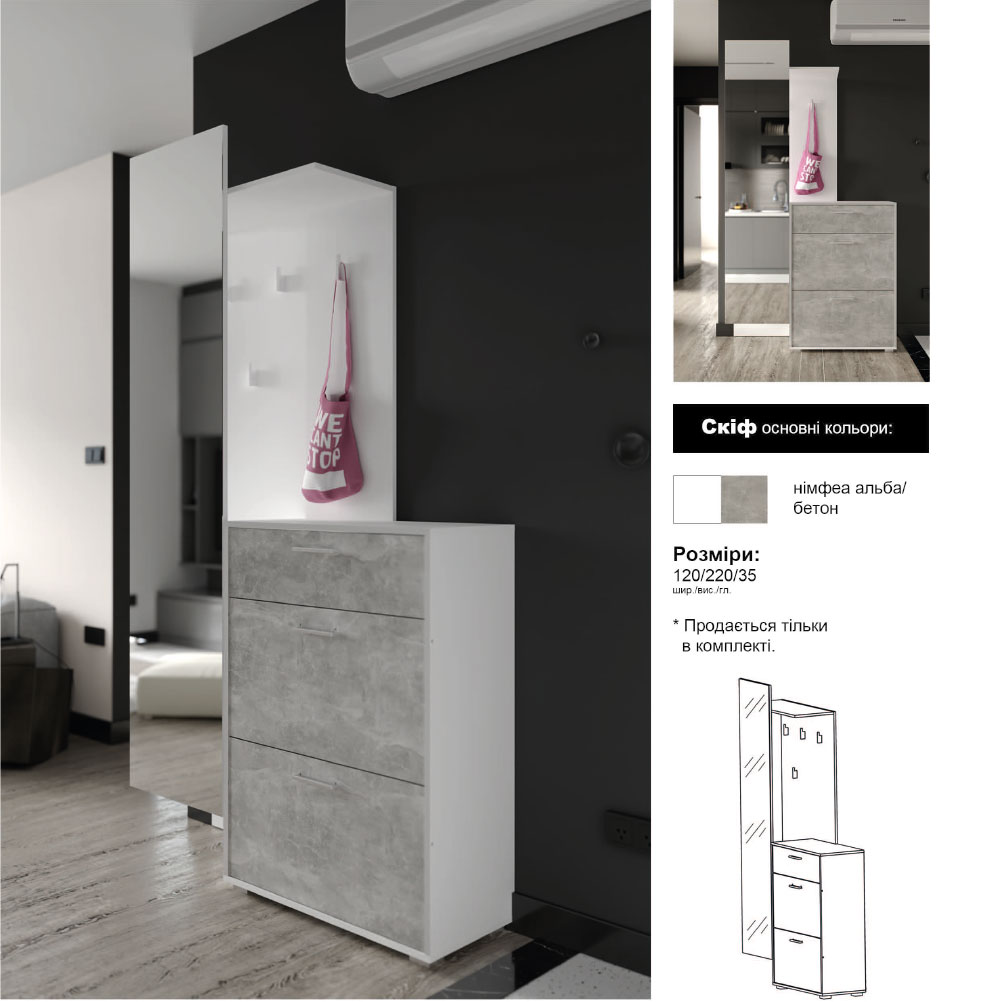 Меблі для створення елегантного інтер’єру. Текстура “бетон” створює сучасний інтер’єр, дзеркало надасть приміщенню легкості, невеликі розміри впишуться в будь-яке приміщення.