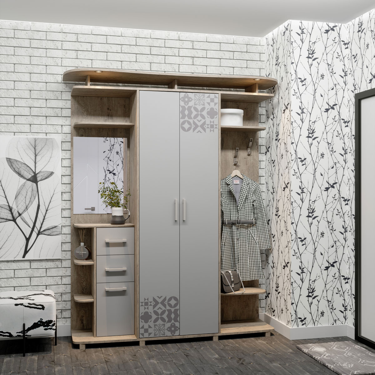 Передпокій Силует 3 від фабрики Світ Меблів стане гідною прикрасою першої кімнати в будинку. Візерунки на його фасадах додають родзинки і краси. Крім того, в тут в цілому все продумано таким чином, що Ви розмістите зручно не тільки одяг і взуття, а й предмети інтер’єру.