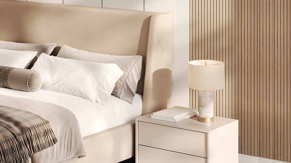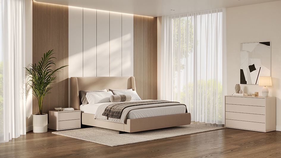Спальний набір “Bruno” – це втілення сучасного стилю та бездоганної функціональності. Головна родзинка колекції — фасади з системою відкривання push-to-open, які не потребують ручок і забезпечують максимально чистий та мінімалістичний вигляд. Легкий дотик — і перед вами відкривається елегантний простір, де кожна деталь продумана до дрібниць. Елементи колекції виконані без лакованого покриття, що надає їм природного вигляду та підкреслює текстуру матеріалу. Колекція включає м’яке непідйомне ліжко розміром 160х200 см, доступне в бежевій тканині Royal Velvet 2 або в інших тканинах на замовлення, шафи, комод і приліжкові тумби. “Bruno” — це ідеальне рішення для створення стильного та комфортного простору, який підкреслить вашу індивідуальність і додасть вашій спальні відчуття справжнього затишку.