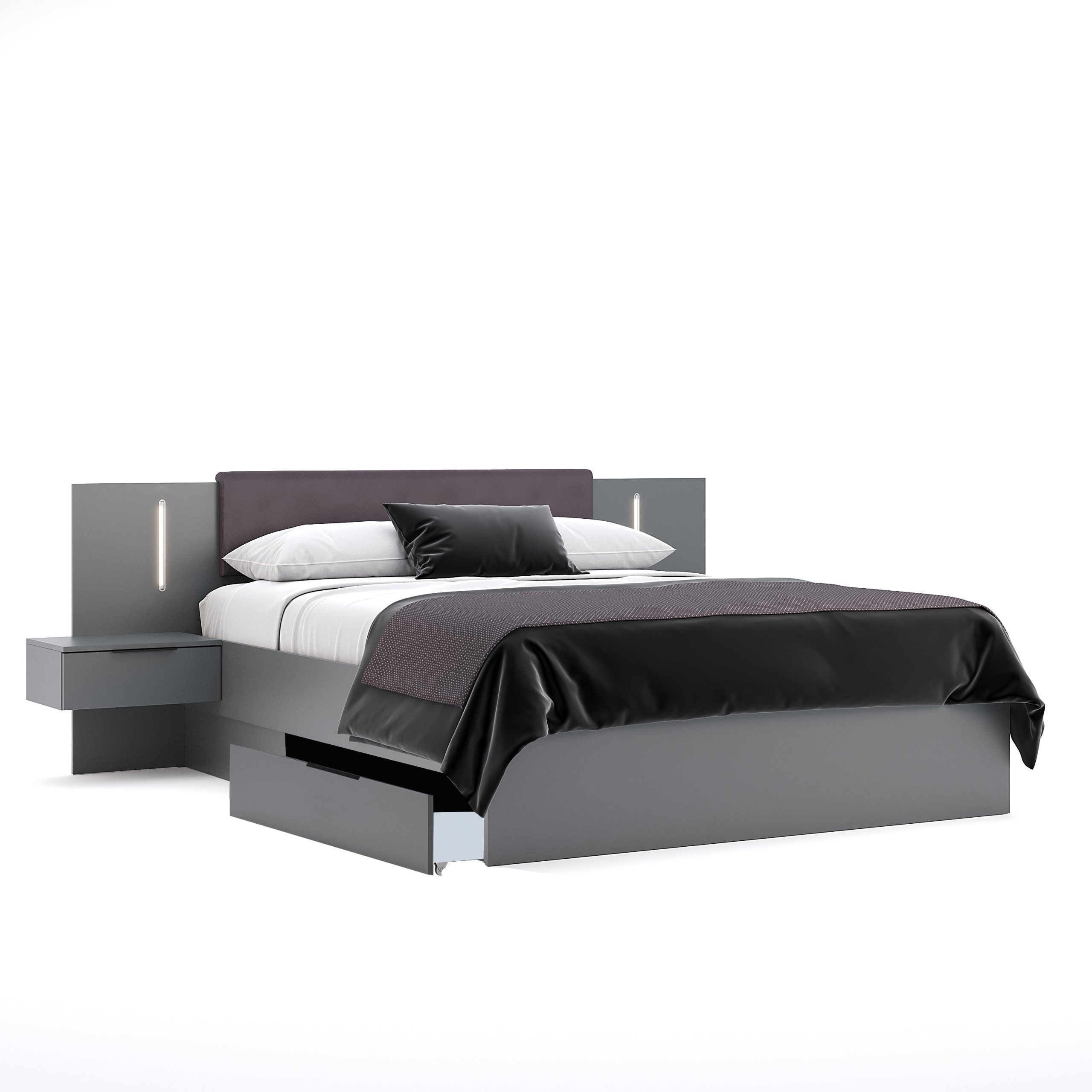 Комплект спальні немов з картинок у Pinterest — затримує погляд з перших секунд. Стильна, яскрава, ефектна Doni. Наповнення будь-якої сучасної спальні з таким набором меблів стане довершеним і унікальним для Вашого дому. Дизайнери MiroMark максимально вдосконалили модель на основі досвіду розробки попередніх моделей.Ми називаємо її сестрою колекції Dominika. Конструкція ліжка Doni та Dominika однакова, проте до моделі Doni ми додали підвісні тумби, що додає ефектності зовнішньому вигляду ліжка. Комфортне, зручне та якісне ліжко Doni з таким трендовим дизайном це просто знахідка. Широке узголів’я з підвісними тумбами доповнює акцентне LED-освітлення, що виконує функцію бра. Також на фоні колекції Dominika – Doni вирізняється своїми монохромними ручками на комоді та у стандартних шафах. Комплектація ліжка включає зручні для щоденного використання висувні шухляди. Перевірено роками — вони легко й швидко висуваються, там комфортно зберігати постільну білизну й ковдри. Основа ліжка має 1.6м, ви можете обрати каркас власного виробництва MiroMark серед 5 варіантів. Doni це смілива модель, що транслює характер та сучасний смак власників.