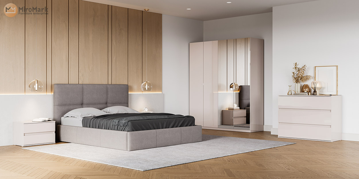 Lily — спальня-новинка, що стане для Вас простором спокою і ніжності. Улюбленим місцем в домі, де панує злагода і комфорт. В основі комплекту м’яке ліжко 1.6 м у сірому кольорі та меблі у кольоровій гамі — Кашемір, що разом створюють особливу атмосферу. Деталі узголів’я ліжка нагадують шоколадні плитки, що робить його дизайн мінімалістичним і водночас сучасним. Матеріал є невибагливим у догляді, його легко чистити і мити. Крім того, ліжко може бути з підйомним механізмом, що дозволяє зберігати речі у ніші і таким чином економити простір шафи. У комплекті спальні Lily доступні під замовлення шафа, комод та приліжкові тумби, виконані у кольорі Кашемір. На вибір шафа з чотирма дверцятами, де дві з них дзеркальні, у повний зріст. Це додає світла і ясності для спальні. Або ж шафа 3дв без дзеркал з мінімалістичним дизайном. Комод і тумби вирізняються фрезерованими ручками, що додає їх вигляду вишуканості та елегантності. Такі ручки є наче приховані, але вони також є зручними й практичними у щоденному використанні. Дизайн є максимально простим, проте цікавим. Будьте певні, спальня збереже свій початковий вигляд на довгі роки, адже якість меблів від MiroMark перевірена роками. Ми виготовляємо наші меблі з ДСП і лакуємо меблі під дією УФ-променів, завдяки чому лакофарбове покриття стає більш якісним і міцним. Шліфуємо фасади за власною унікальною технологією, у результаті — поверхня залишається ідеально гладкою, майже дзеркальна.