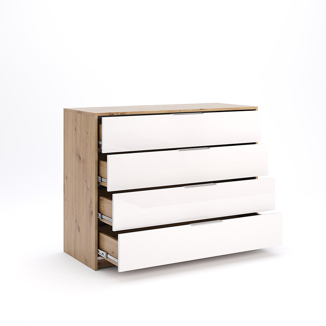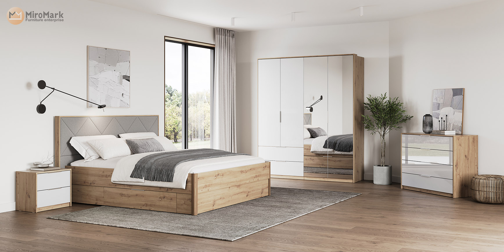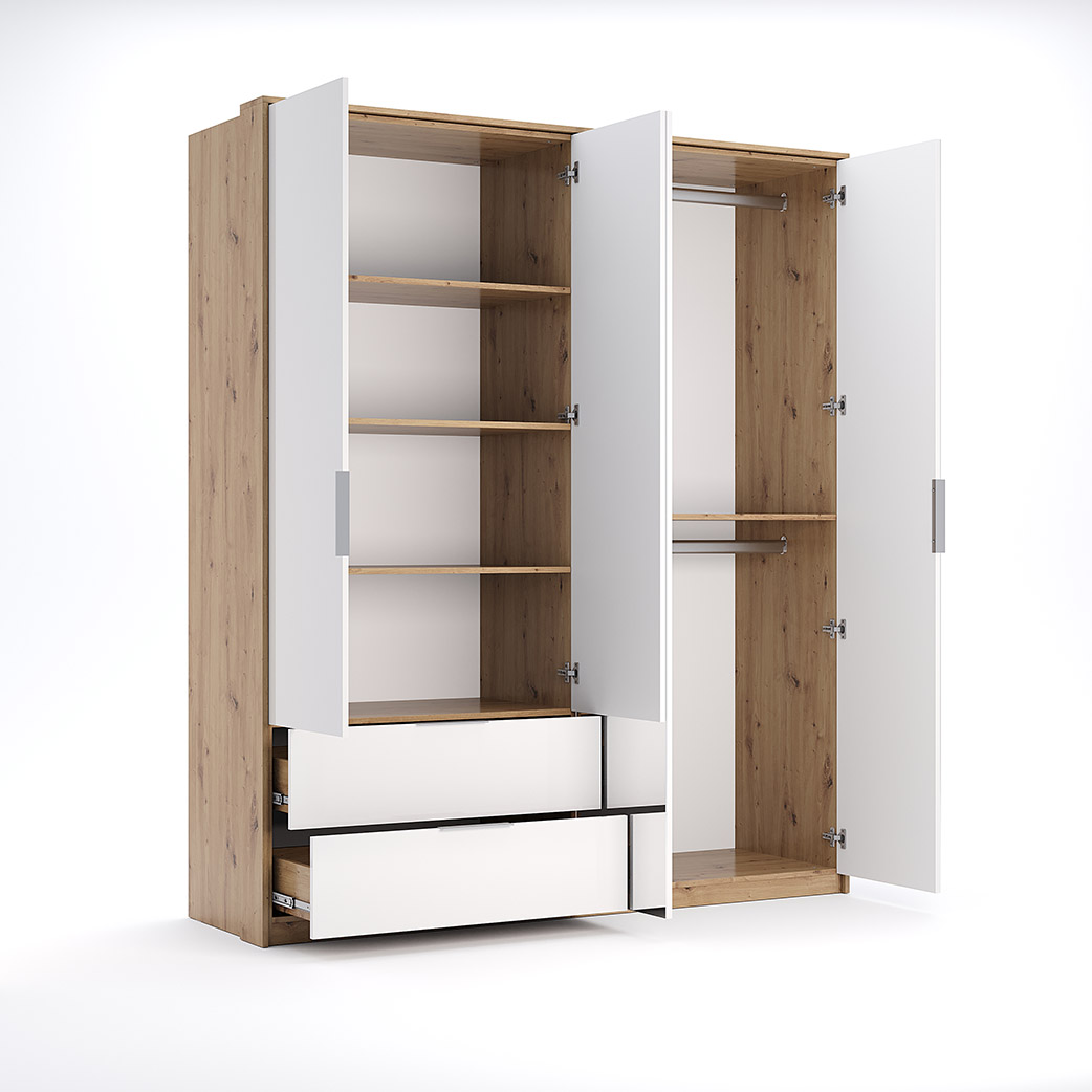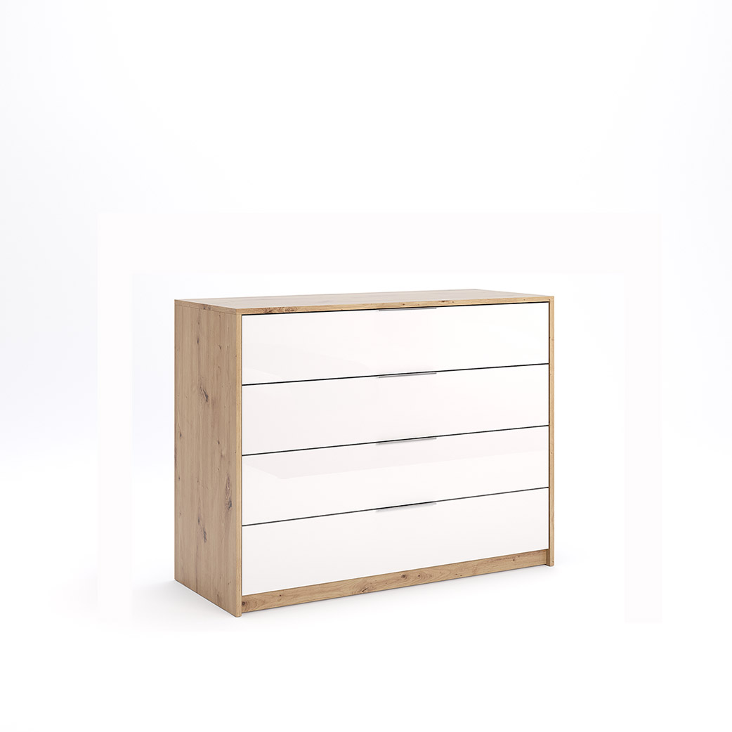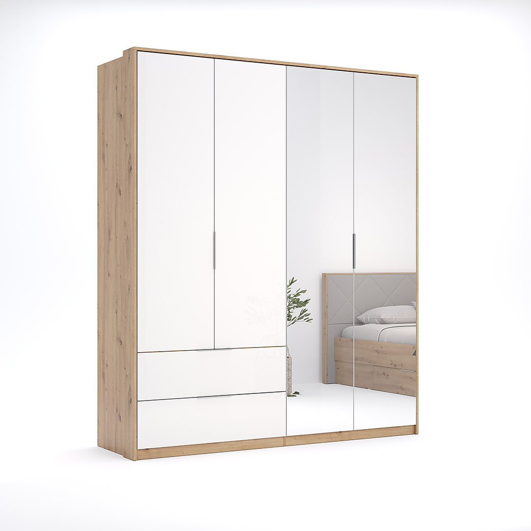 Cпальня Raymond у кольорі Глянець Білий – Дуб Артізан – створює кольорову гармонію, де фактури вишукано доповнюють один одного. Спальня чудово підійде для кімнати невеликого розміру, адже світла кольорова гама візуально збільшує приміщення. До комплекту входить ліжко з м’яким узголів’ям та стильним сучасним дизайном, що стане головним акцентом спальні. Воно приваблює своєю вишуканістю та зручністю. В основі ліжка є висувні полиці, які знадобляться вам для швидкого доступу до особистих речей, також там дуже зручно складати постільну білизну і ковдри. Комод Raymond є невеликим у порівнянні з шафою, містить три шухляди, але його компактність дозволяє зручно складати білизну та зберігати речі, що потрібні під рукою. Щодо шафи — ми впевнені, що це справжня знахідка для сучасних господинь. Завдяки своїй функціональності та стильному дизайну, вона ладна замінити вам повноцінний гардероб. З 4 дверцятами та 2 шухлядами, вона забезпечить достатньо місця для зберігання вашого одягу, взуття та аксесуарів. Разом з тим, дзеркальні дверцята додають кімнаті візуального простору та роблять її світлішою. Комфортно, стильно і якісно — це поєднання можливе! І втілене у спальню Raymond. Також спальня доступна в продажі у темній кольоровій гамі — Дуба Артізан – Мат Антрациту.