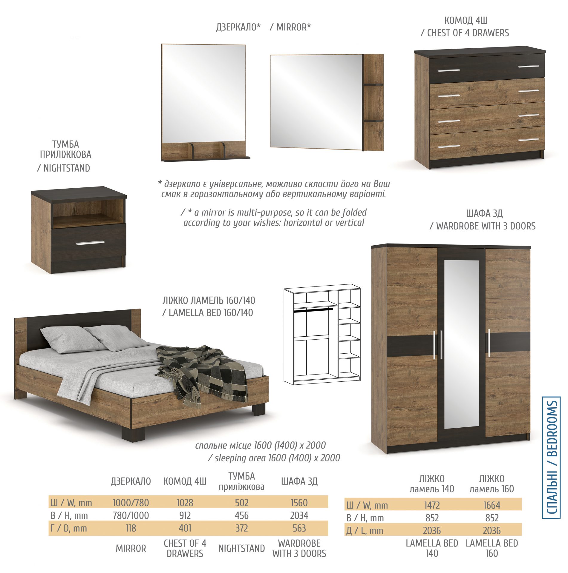 Незвичайне забарвлення, здавалося б, стандартного набору обстановки в спальню відразу привертає увагу.