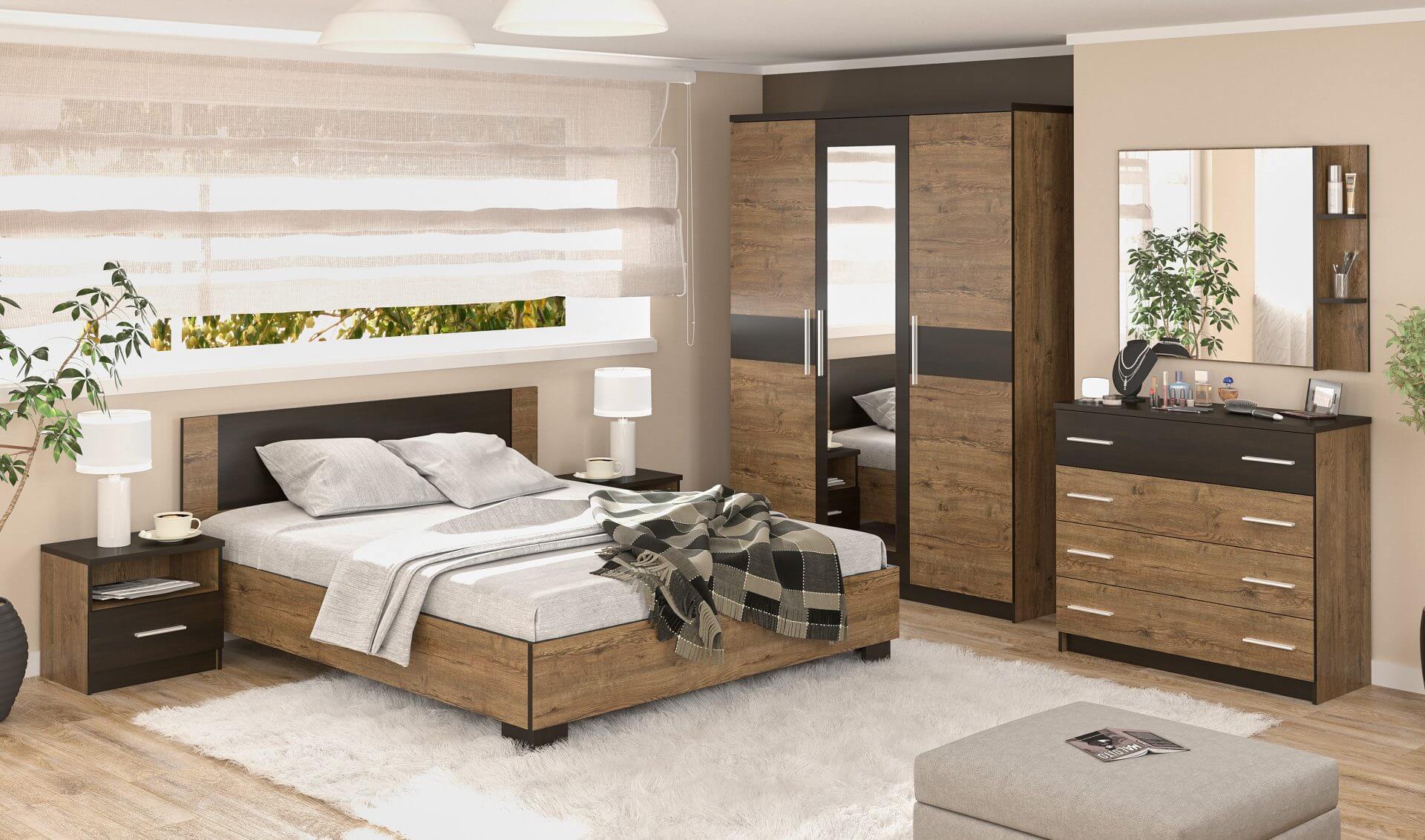 Незвичайне забарвлення, здавалося б, стандартного набору обстановки в спальню відразу привертає увагу.