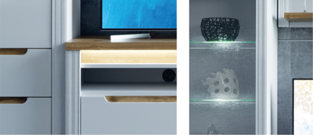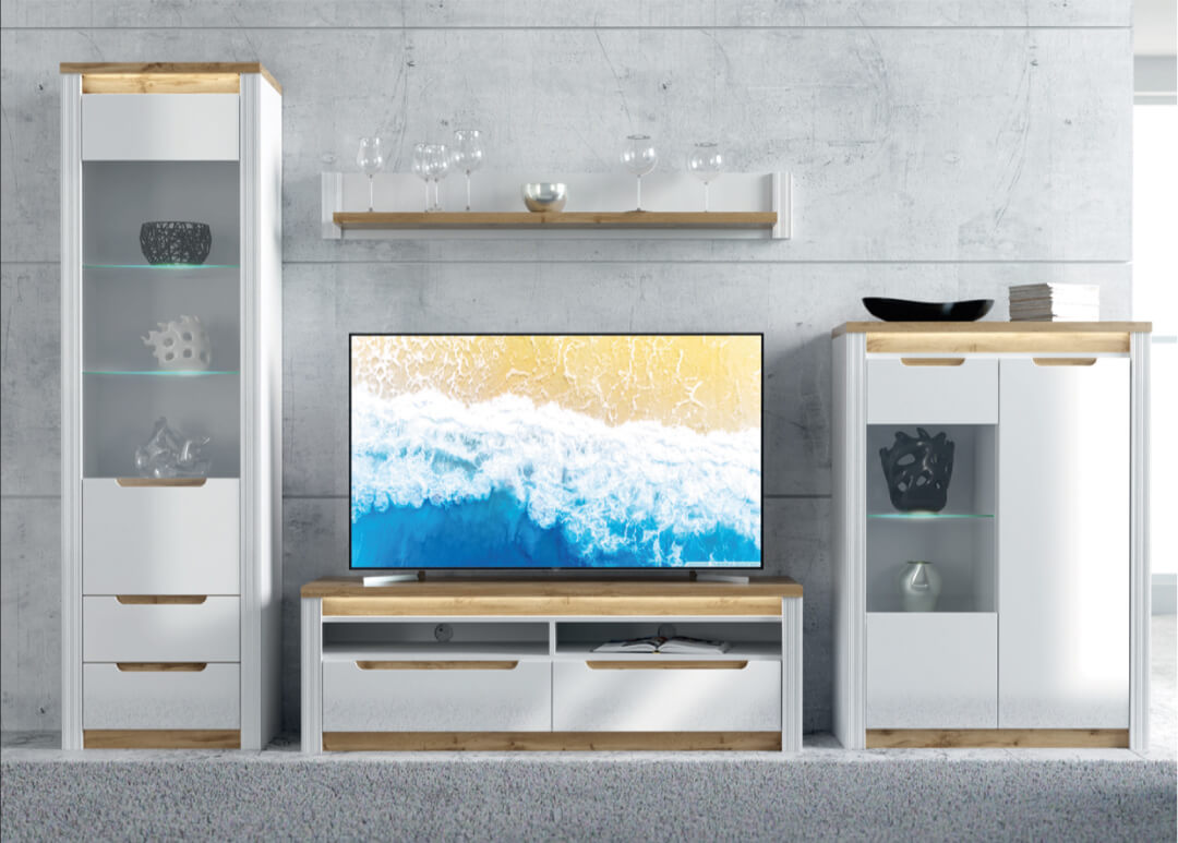 Вітальня Сансет від Гербор – розкішний та благородний набір для вітальні. Набір поєднкє в собі повітряний білий колір із контрасною вставкою “тахо”, зручні продовгуваті ручки, підсвітку, скляні вітрини, які прикрасять вашу вітальню.