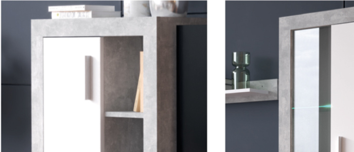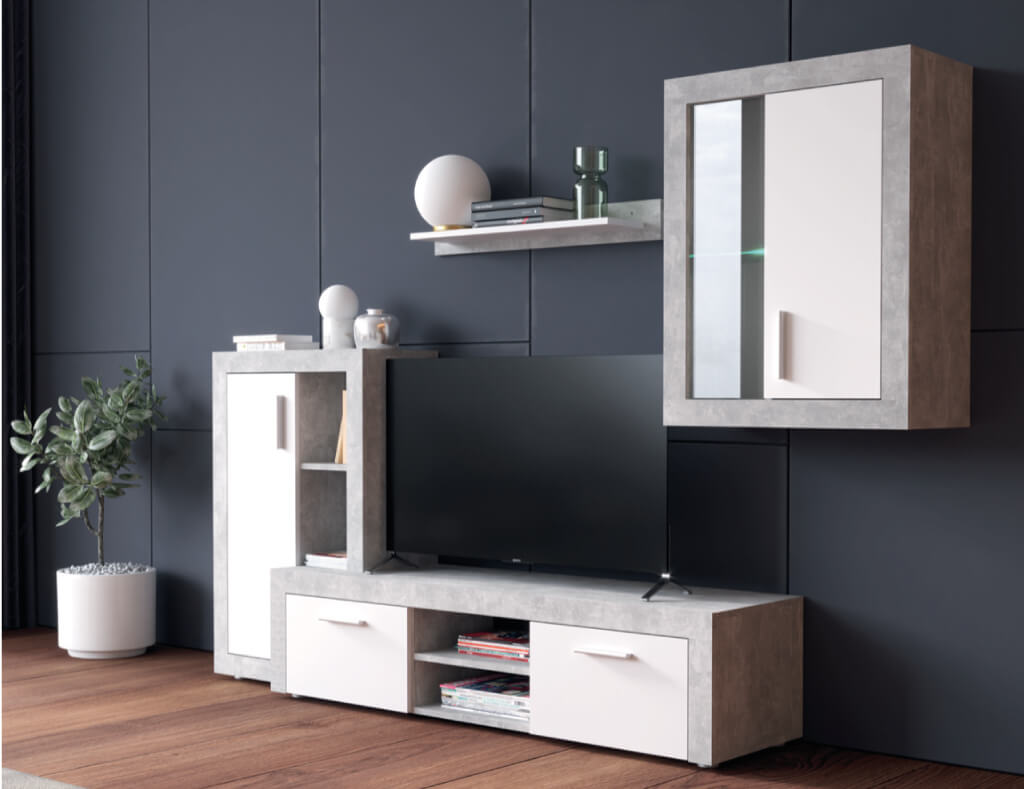 Вітальня Тюна міні від Гербор – невеликий набір для вітальні, який ідеально впишеться в будь-яке приміщення. Завдяки оригінальному декору модель підійде для оформлення інтер’єру в стилі лофт та для більш стриманих рішень. На відкритих полицях прекрасно виглядатимуть книги у яcкравих обкладинках чи декоративні кашпо з рослинами.